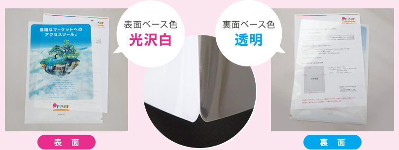 【特徴】※印刷面定着加工:表裏同じ 従来のクリアファイルと同様に透明の状態。 内容物が見える様にしています。 |